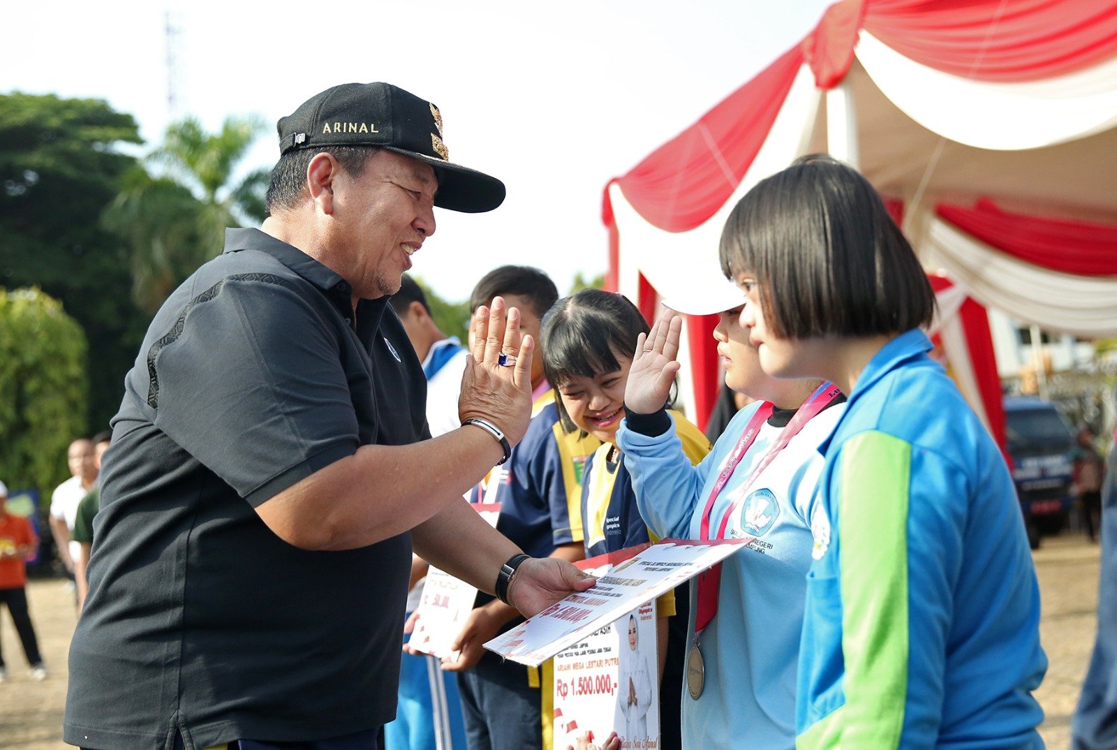 Seusai mengikuti senam, Gubernur Arinal menyerahkan uang pembinaan kepada Atlit PeSONas SOIna Lampung yang berhasil meraih juara pada PeSONas di Semarang, Jawa Tengah.
