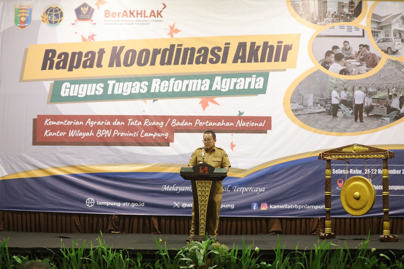 Dalam kesempatan yang sama, Kepala Kantor Wilayah BPN Provinsi Lampung, Kalvyn Andar Sembiring menyampaikan Reforma Agraria merupakan salah satu program strategis dilingkungan Kementeria Agraria dan Tata Ruang yang memiliki peran penting dalam upaya pemerataan struktur, penguasaan, pemilikan, penggunaan dan pemanfaatan tanah untuk mewujudkan keadilan ekonomi yang berkeadilan.