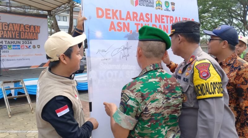 Hal ini, disampaikan Perwira Seksi Operasi (Pasi Ops) Kodim 0602/Serang Mayor Inf Aryadi, mewakili Komandan Kodim (Dandim) 0602/Serang Letnan Kolonel (Letkol) Inf Mulyo Junaidi, S.E., M.Tr (Han), saat mengikuti kegiatan Deklarasi Netralitas TNI-Polri juga Apel Siaga Pengawasan Dan Deklarasi Kampanye Damai pada Pemilu Tahun 2024, yang diselenggarakan Bawaslu Kota Serang, bertempat di Lapangan Kantor Pemerintah Kota Serang Provinsi Banten, Jum’at (24/11/2023).