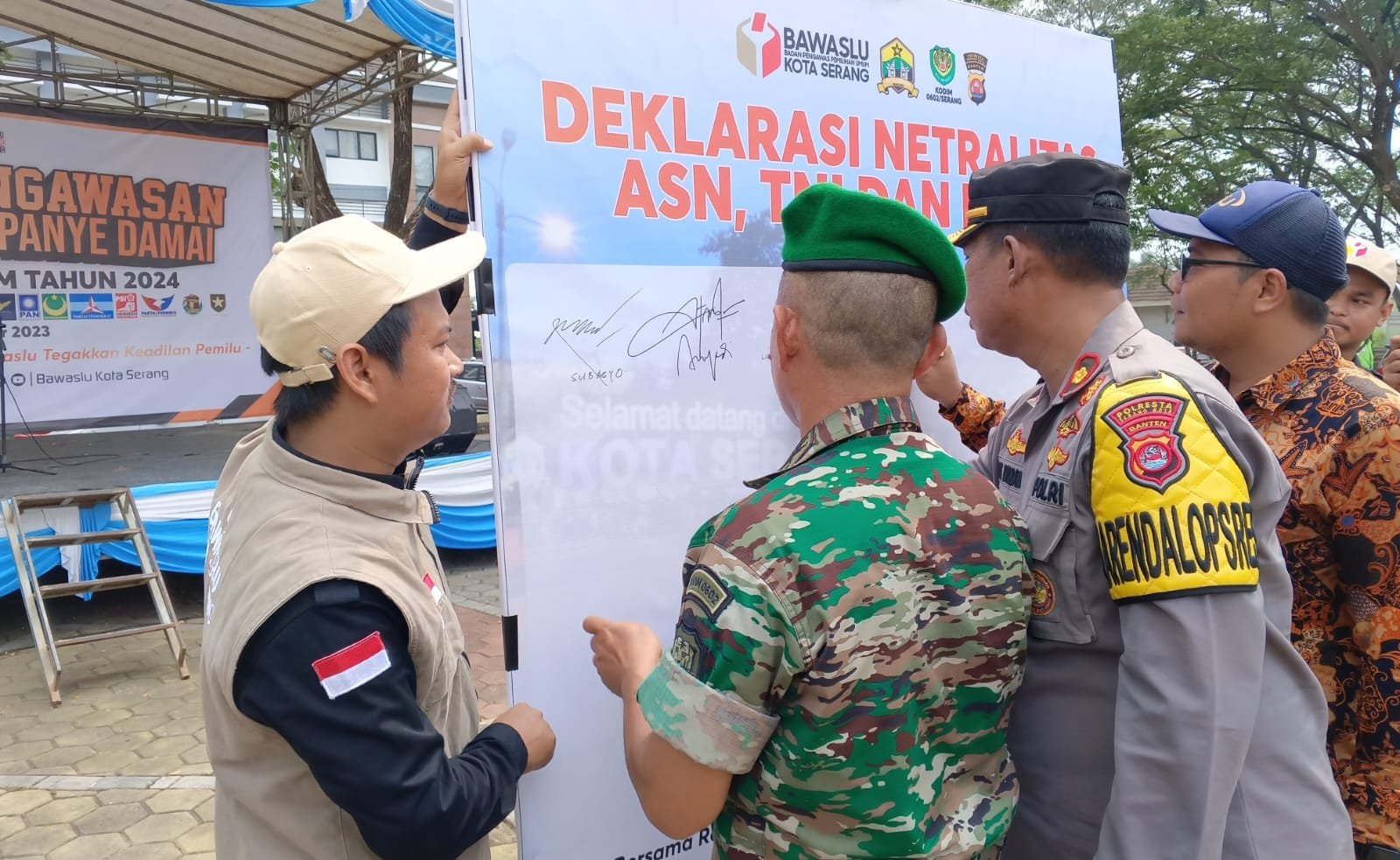 Hal ini, disampaikan Perwira Seksi Operasi (Pasi Ops) Kodim 0602/Serang Mayor Inf Aryadi, mewakili Komandan Kodim (Dandim) 0602/Serang Letnan Kolonel (Letkol) Inf Mulyo Junaidi, S.E., M.Tr (Han), saat mengikuti kegiatan Deklarasi Netralitas TNI-Polri juga Apel Siaga Pengawasan Dan Deklarasi Kampanye Damai pada Pemilu Tahun 2024, yang diselenggarakan Bawaslu Kota Serang, bertempat di Lapangan Kantor Pemerintah Kota Serang Provinsi Banten, Jum’at (24/11/2023).