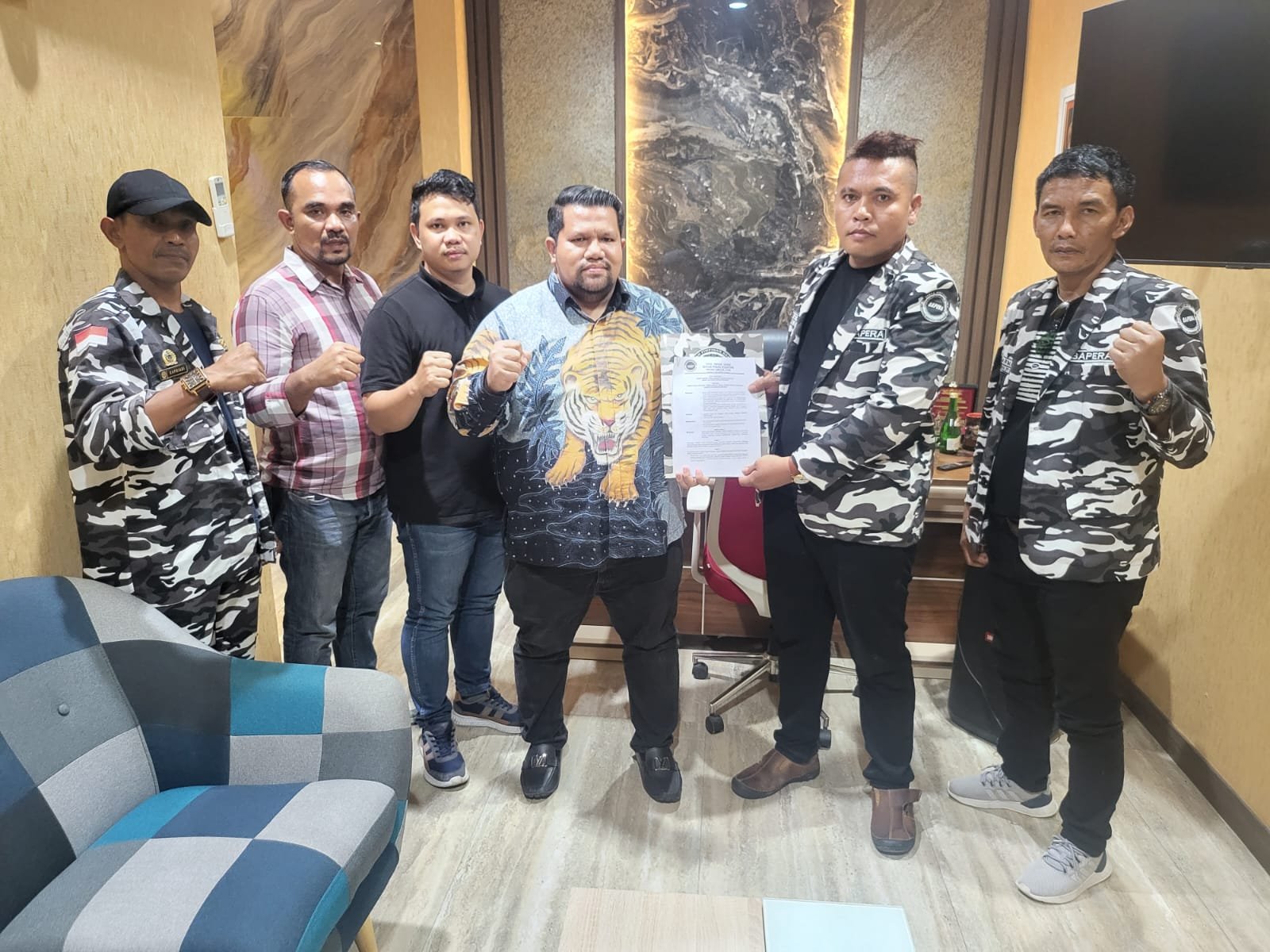 Ketua DPD Bapera Sumut, Abdul Rahman didampingi bidang OKK Sandi Izhandri, SH, MKN, beserta jajaran DPD Sumut, dan Ketua DPD Batu Bara Helmi Syam Damanik SH.MH, menyerahkan SK Mandat Pengurus DPD Bapera Kabupaten Serdang Bedagai.