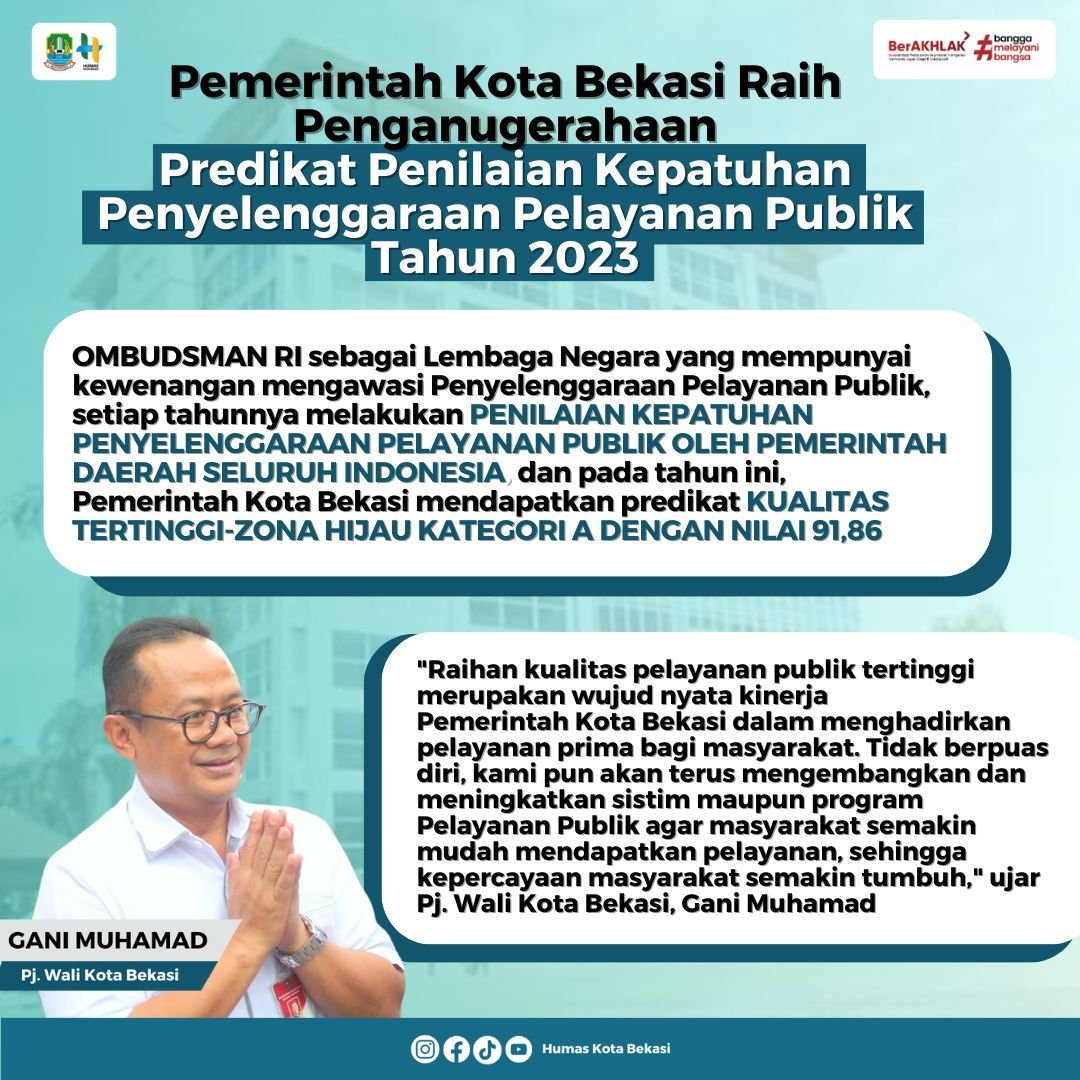 Pemerintah Kota Bekasi Raih Kualitas Tertinggi dalam Penilaian Kepatuhan Penyelenggaraan Pelayanan Publik Tahun 2023