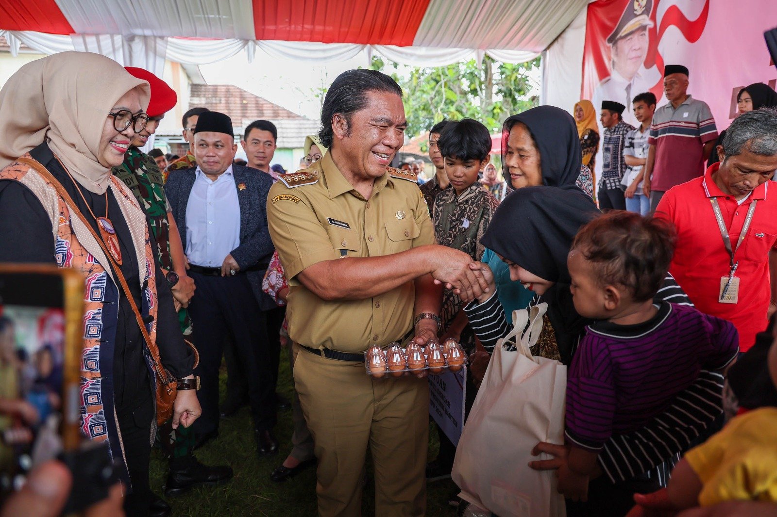 telur dan susu UHT ukuran 125ml sebanyak 90 buah; Bantuan usaha ekonomi produktif (UEP) se-Provinsi Banten 740 penerima untuk Kab.Pandeglang 150 penerima masing-masing Rp. 2.500.000; Bantuan alat bantu dengar bagi disabilitas sebanyak 39 pasang se Provinsi Banten, untuk Kabupaten Pandeglang sebanyak 5 pasang; Bantuan beras untuk Kabupaten Pandeglang sebanyak 3.550 KPM masing-masing 10 Kg; Bantuan makanan bernutrisi untuk anak Stunting sebanyak 425 paket se-Provinsi Banten, untuk Kabupaten Pandeglang sebanyak 55 paket, jenis bantuan yang diberikan berupa beras fortifikasi: telur, Susu UHT, Kacang hijau, biskuit regal, gula aren dan minyak goreng; Bantuan pemberdayaan ekonomi perempuan untuk anak perempuan kepala keluarga dan orang tua anak stunting, jenis bantuan yang diberikan Oven dan Loyang sebanyak 2.200 penerima se-Provinsi Banten untuk Kabupaten Pandeglang 445 penerima; Bantuan chopper sebanyak 385 penerima se-Provinsi Banten untuk Kabupaten Pandeglang 35 penerima; Bantuan natura untuk perempuan dan anak penyintas kekerasan sebanyak 100 orang berupa beras, kacang hijau, sarden, teh celup, susu, minyak goreng dan tepung terigu; Bantuan benih padi untuk 2 Ha, sebanyak 50 Kg, dan sarana produksi pupuk organic dan pupuk hayati cair penerima Poktan Bantar Jaya II; Bantuan benih bawang merah 250 Kg, Insektisida Karbofuran 3 G masing-masing 5 Kg, Mulsa Plastik Hitam Perak 4 Roll, Pupuk Organik Granule @250 Kg, NPK 16 masing-masing 100 Kg, TSP/SP36 masing-masing 25 Kg, KCI masing-masing 25 Kg, Penerima Gapoktan Subur Makmur; Bantuan ikan konsumsi sebanyak 100 bag masing-masing 1 Kg; Bantuan listrik Desa 2.500 Rumah Tangga Sasaran se-Provinsi Banten, untuk Kabupaten Pandeglang 53 Rumah Tangga Sasaran; Bantuan BPJS Peserta Bukan Penerima upah yang dibiayai oleh Provinsi Banten untuk Kabupaten Pandeglang sebanyak 107.016 jiwa; Bantuan Keuangan kepada Pemerintah Desa untuk Kabupaten Pandeglang 326 Desa; serta Penyerahan Sertifikat Hak Atas Kekayaan Intelektual (HAKI) bagi UMKM di Kabupaten Pandeglang sebanyak 17.(Wan)
