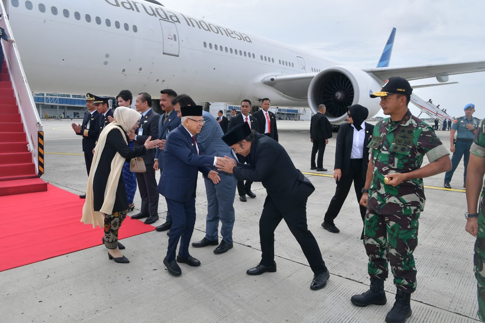 JAKARTA.GERBANGPATRIOT.COM – Tangerang, Penjabat (Pj) Gubernur Banten Al Muktabar sambut kedatangan Wakil Presiden (Wapres) Ma’ruf Amin bersama Ibu Wury Ma’ruf Amin beserta rombongan dari Kunjungan Kenegaraan ke Selandia Baru dalam rangka diplomasi industri halal. Pesawat Kepresidenan GA-02 Boeing 777-300ER mendarat di Bandara Soekarno Hatta, Kota Tangerang pada pukul 14.40 WIB, Minggu (2/3/2024).